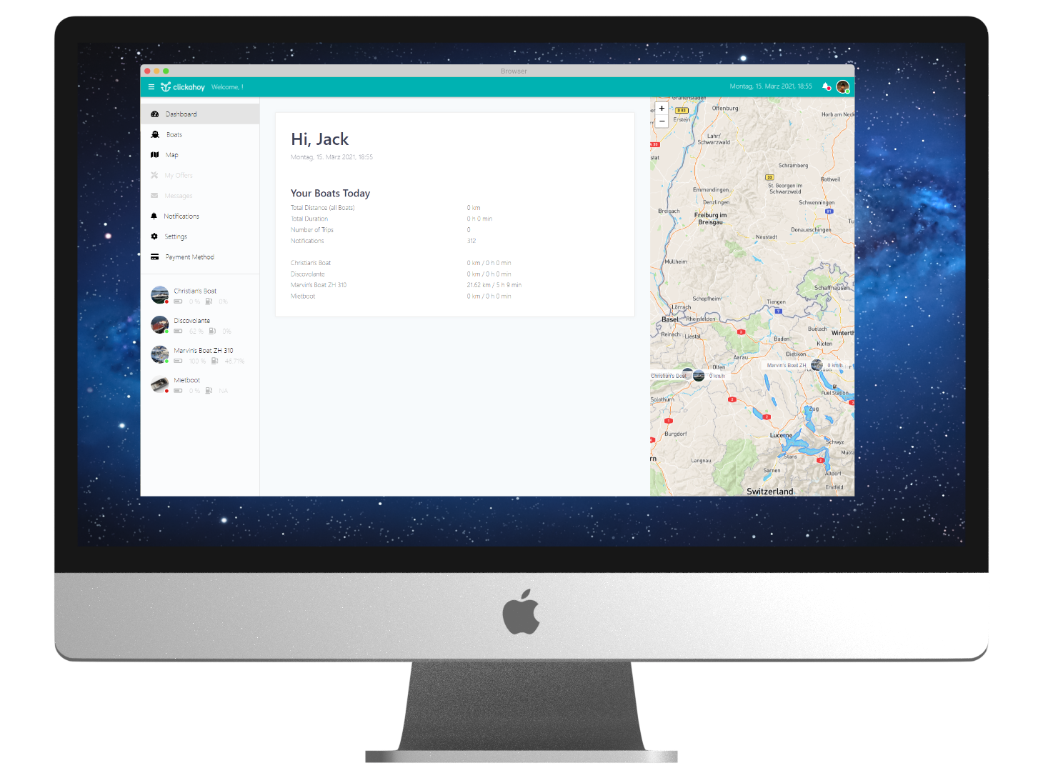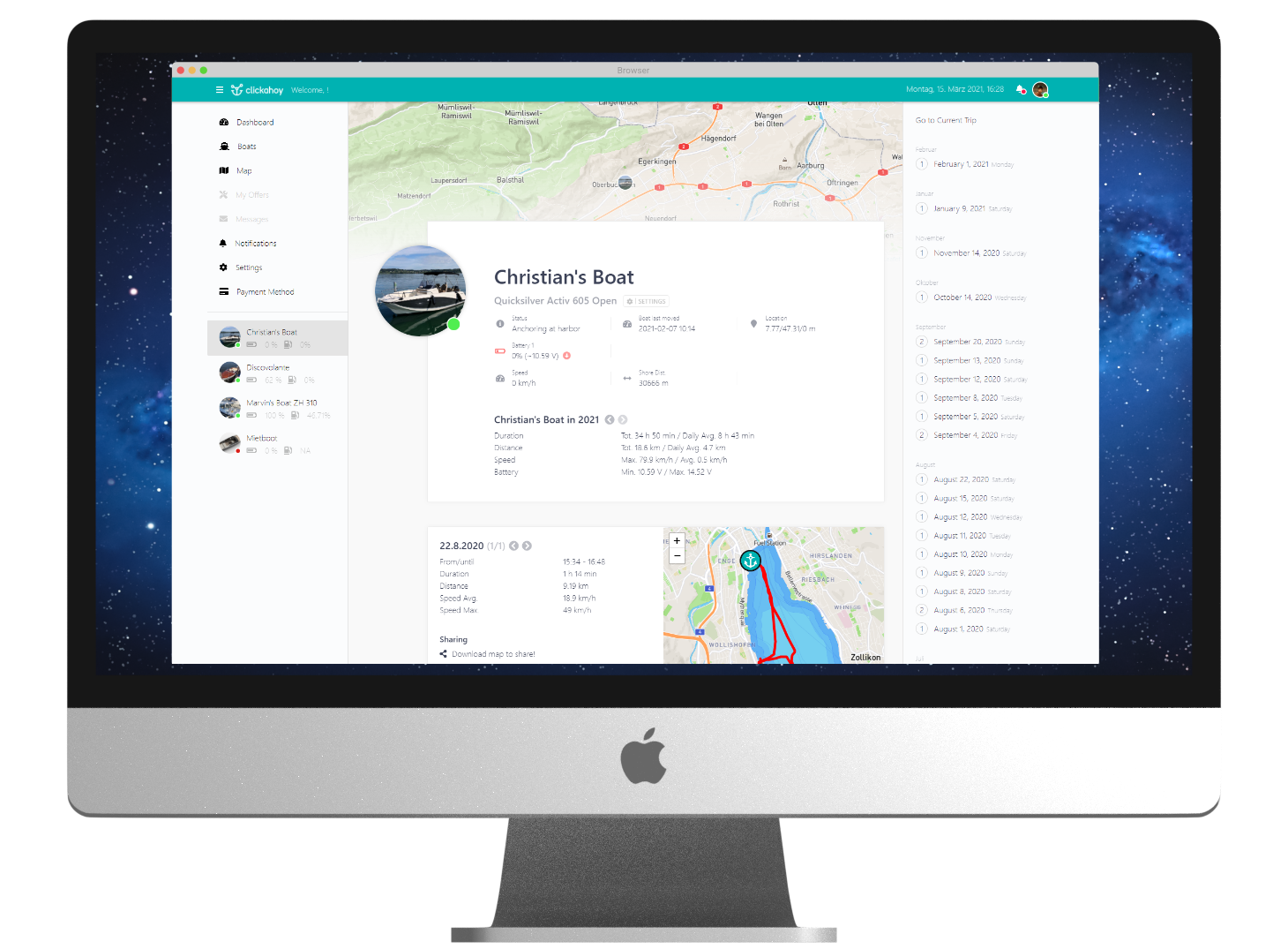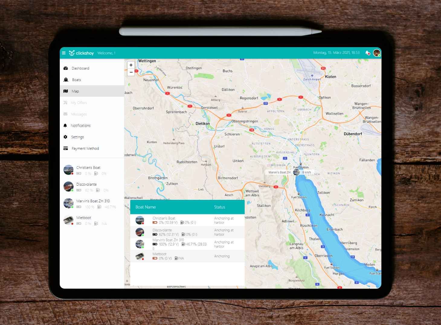 Whether sports boat, motor yacht, sailboat, or electric ship. Simply get equipped with the clickahoy computer, download the mobile app or log in via dashboard on clickahoy.io and benefit from more safety, control and comfort.